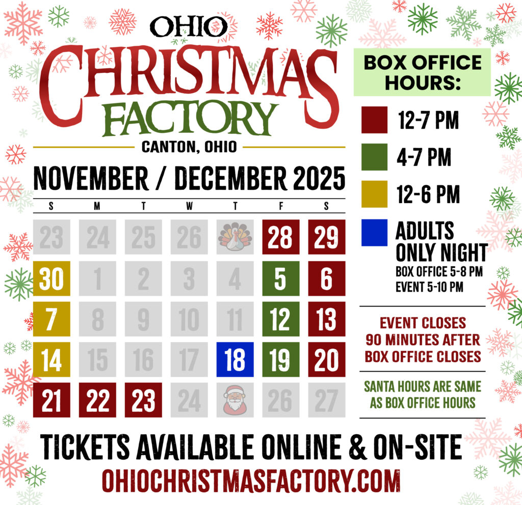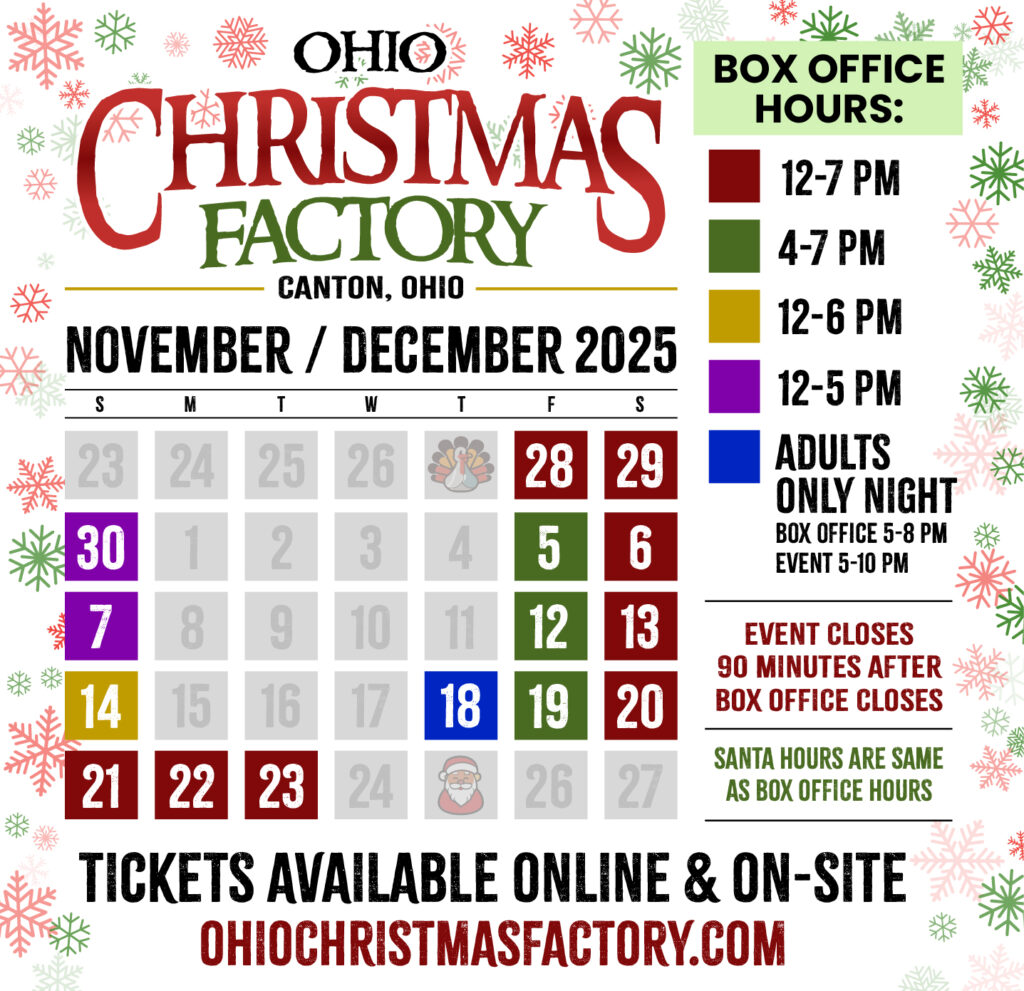 With over 50,000 square feet of indoor & heated space, the Ohio Christmas Factory is sure to become a holiday tradition.