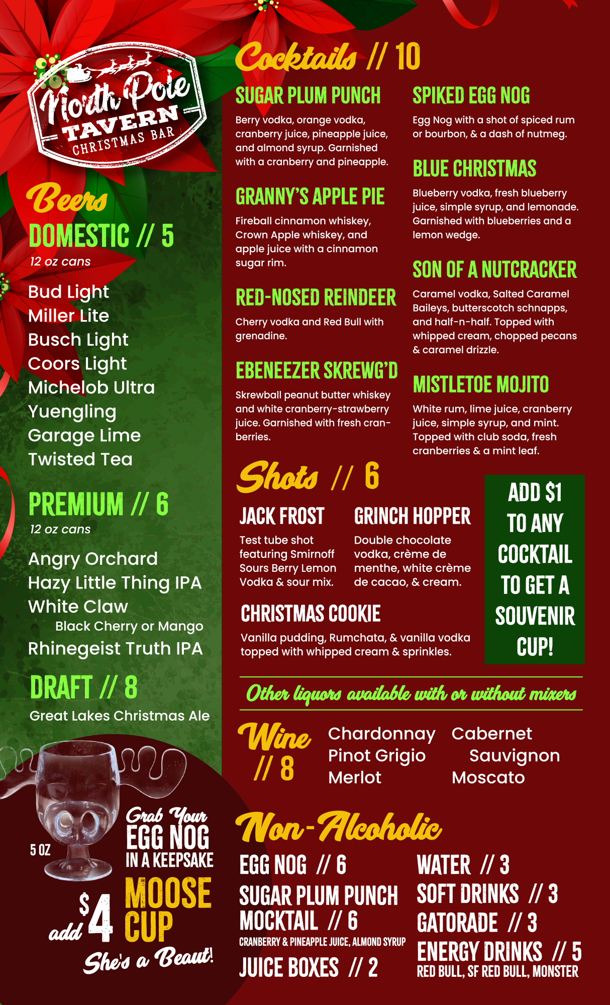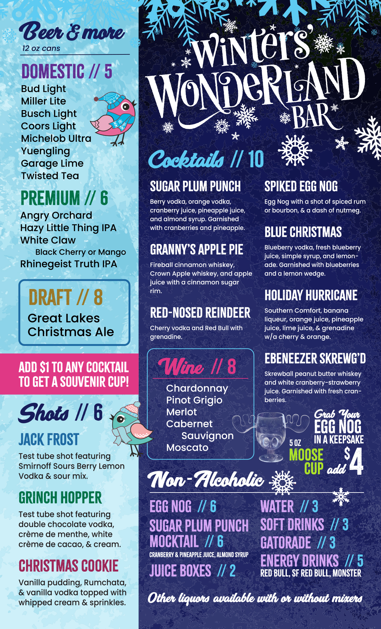 While enjoying the sights & sounds of our event, all guests may stop at one of our 4 bars. Enjoy specialty cocktails & shots, and rotating seasonal draft beers in the North Pole Tavern and Winters’ Wonderland Bar!
