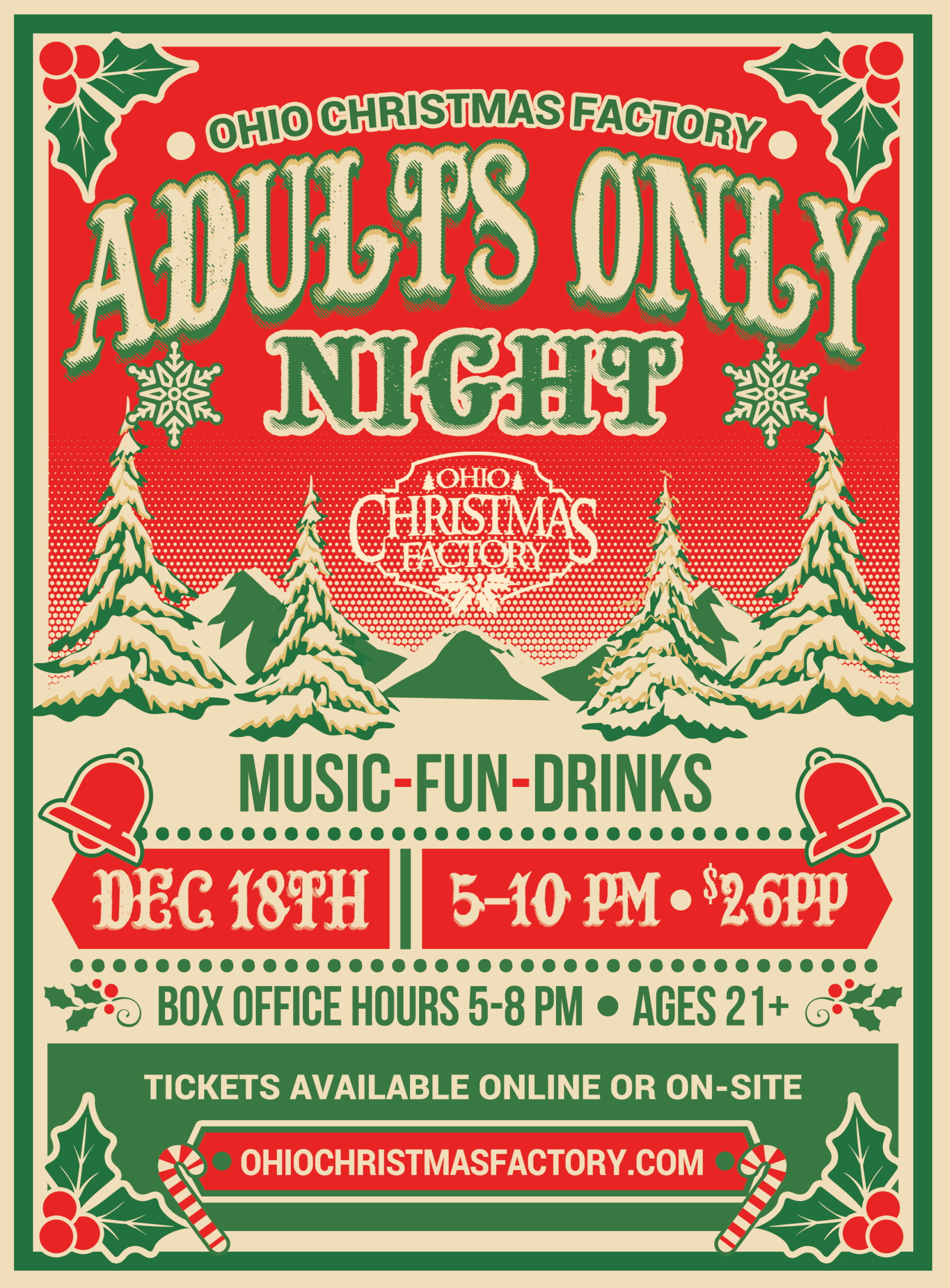 You do NOT need to buy separate event admission to attend, only an Adults Only Night ticket is required. Most of the Christmas Factory event will be open for this party, with a few exceptions