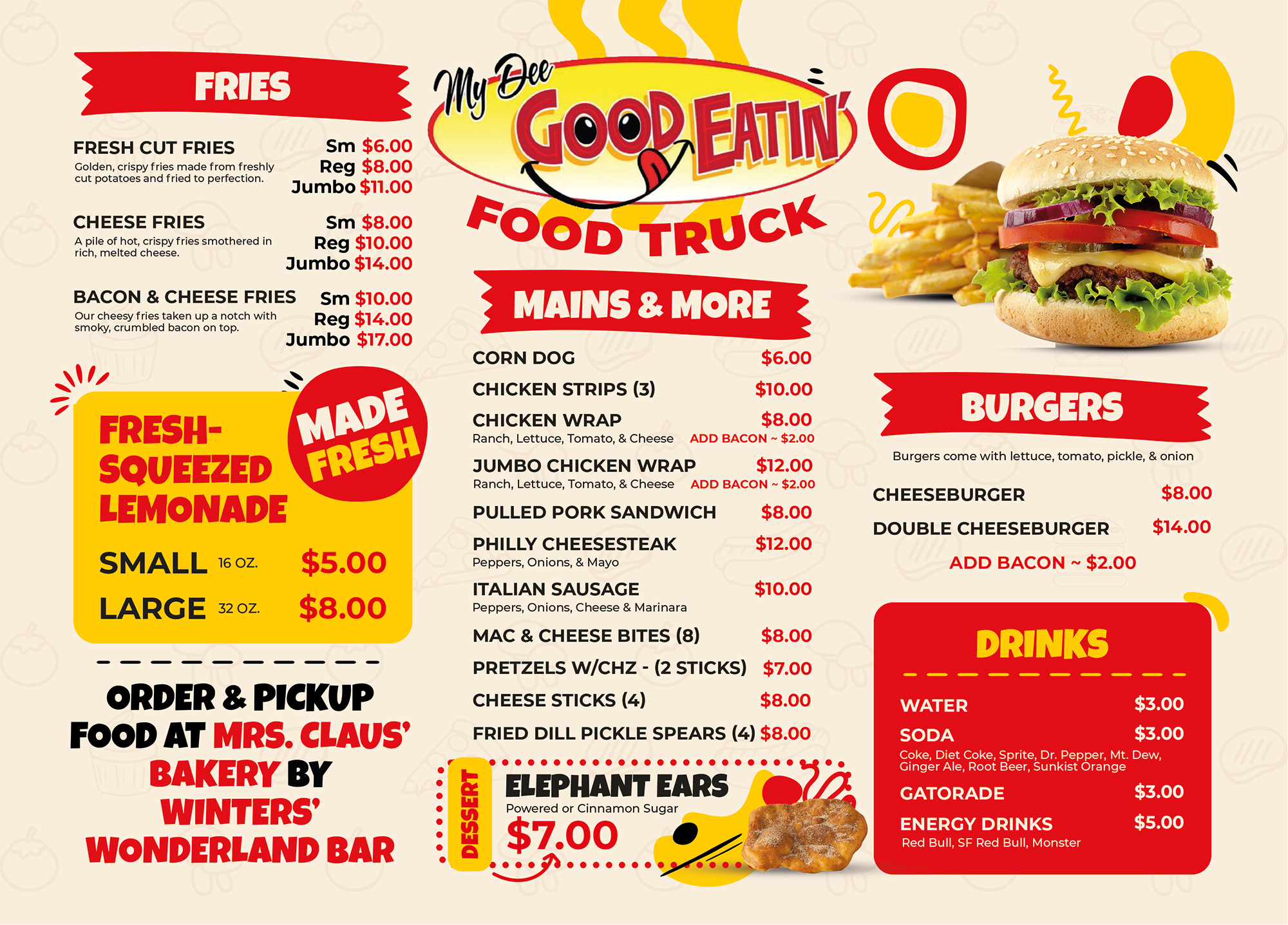 Find our new food kiosk in our Winters’ Wonderland bar/Bourbon Street area.